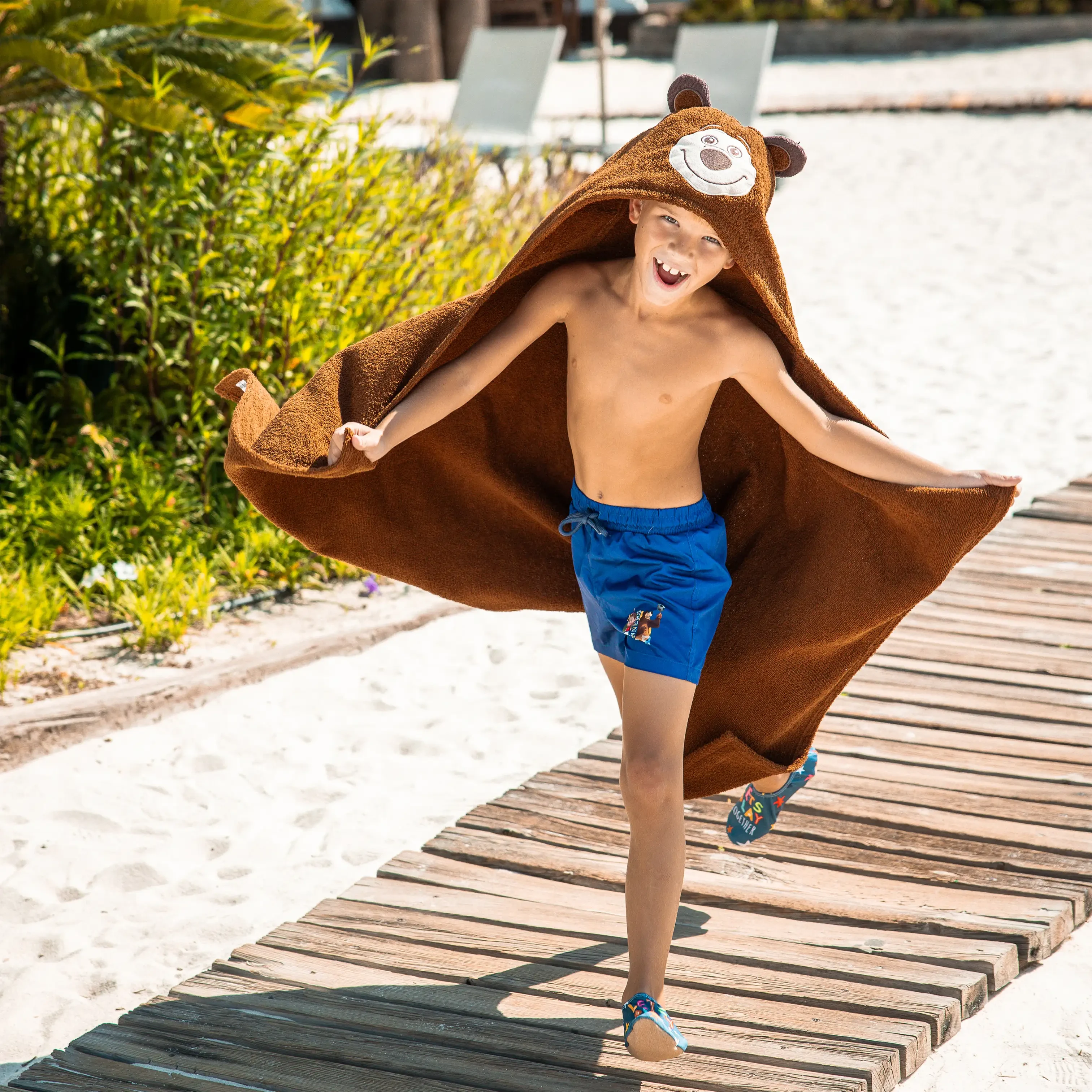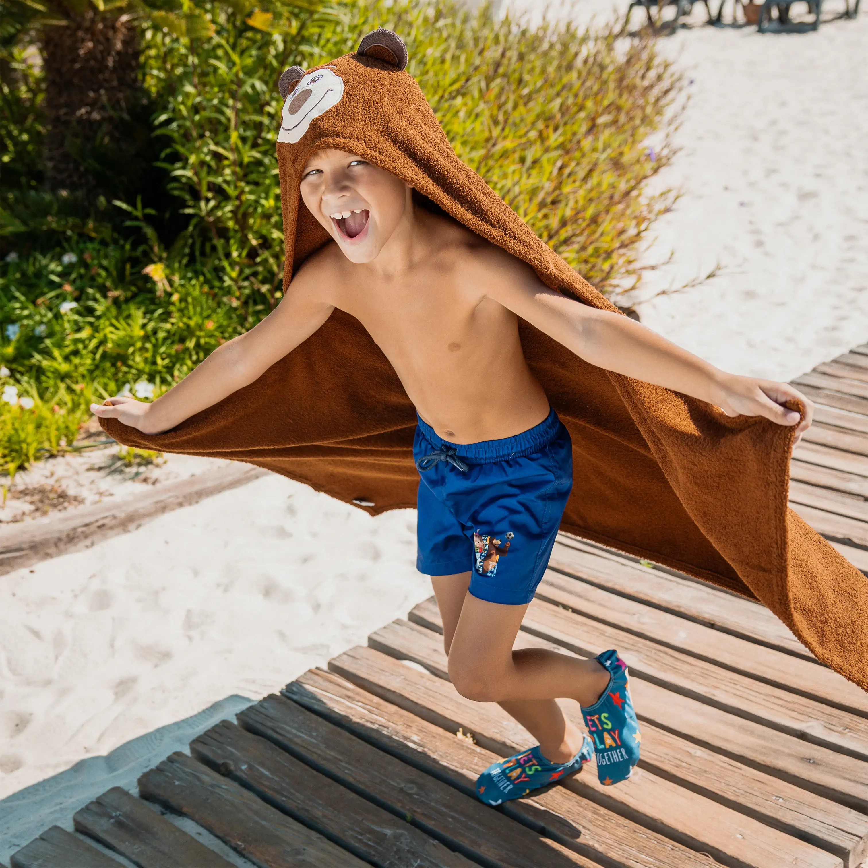 Sevilen karakter Koca Ayı'nın sevimli baskısıyla süslenmiş bu havlu panço, çocukların plajda veya havuzdan sonra kolayca kurulanmasını ve rahatça dolaşmasını sağlar. Kapüşonlu tasarımı sayesinde hem saç hem vücut kuruluğu sağlarken, eğlenceli görünümüyle minikleri mutlu eder.